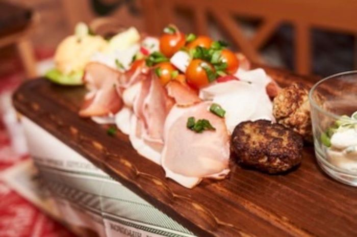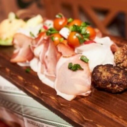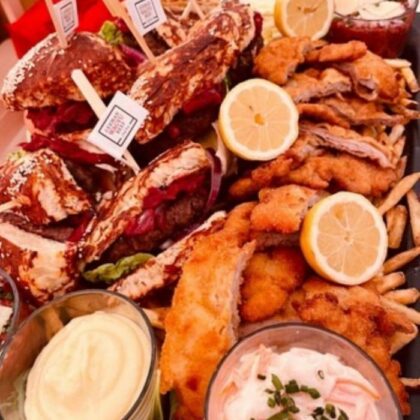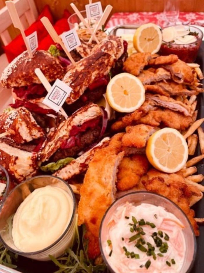 Pikant angemachtes Rindertatar, bayerischer Wagyu-Beef-Burger im Laugenweckerl mit Rotweinschalotten, Streifen vom Kaiser Wiener Schnitzel vom Kalb, Gambas in Knoblauchöl, Pommes skin on, cole Slaw Salat, Trüffelmayonnaise, Wildpreiselbeeren!