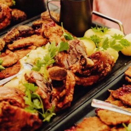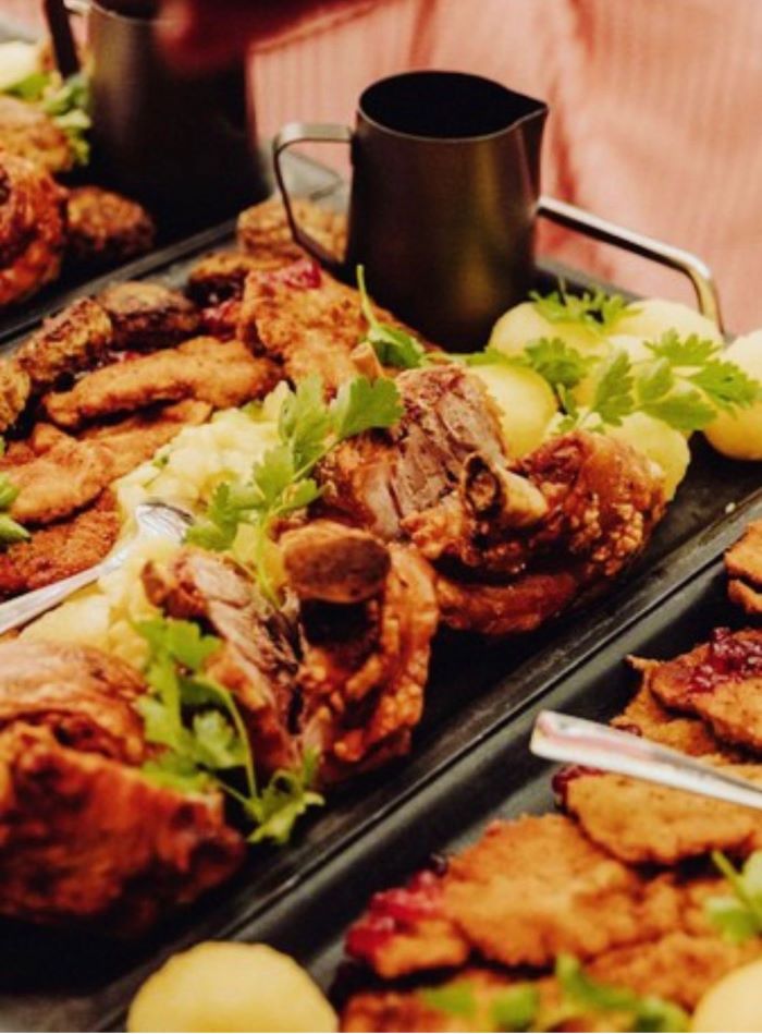 Spanferkelhaxerl – rösch aus dem Rohr -, geriebener Kartoffelknödel, Natursoße, Wiener Schnitzel – mit Andechser Almbutter gebraten-, Kartoffel-Gurken-Salat, Andechser Fleischpflanzerl – aus der Pfanne